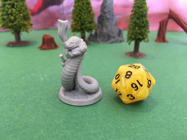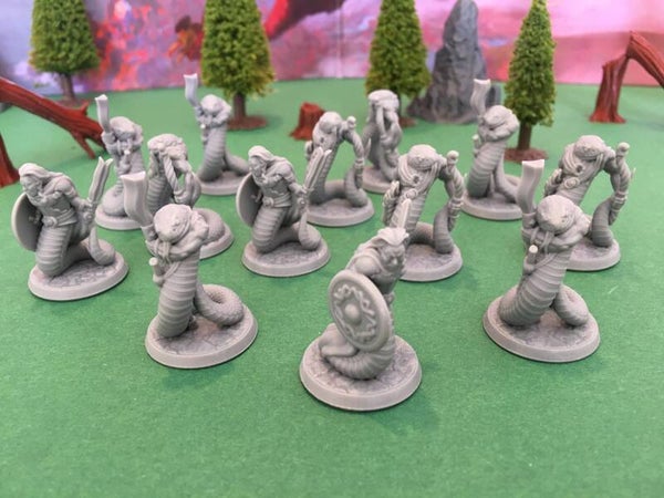 As you cut away the vines blocking your way through the jungle, you suddenly hear a hissssss, comming from behind you. Suddenly, something slithers past you and a scaly face stares straight at you. These serpentfolk Yuan-Ti are the perect adversaries for adventurers esploring deep jungles, forests, or swamps. They can be bought separately, or in groups of 5, 10, or 15. You can specify your group composition by sending a message with your order, or go for the parties depicted in the pictures. In total there are 3 different Yuan-Ti to choose from: