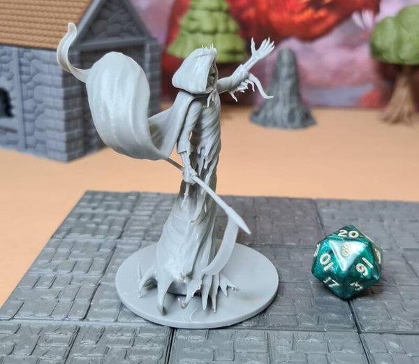 The Grim Reaper Miniature is scaled for 28mm games common in D&D, Pathfinder, and most other popular tabletop games.