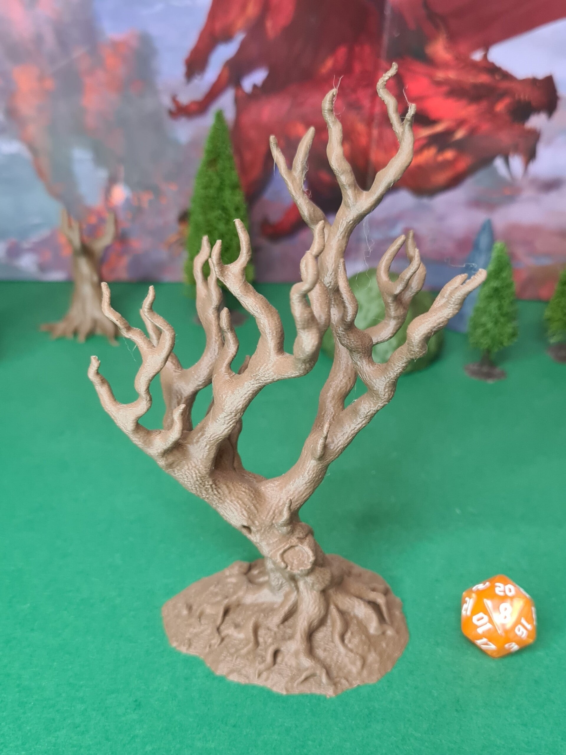 These miniature props are scaled for 28mm games common in D&D, Pathfinder, and most other popular tabletop games. The trees are 8cm x 5cm x 14cm (LxWxH) and have a 6cm x 7cm base. If you'd like the trees in another size, please send s a message and we can make you a custom offer.