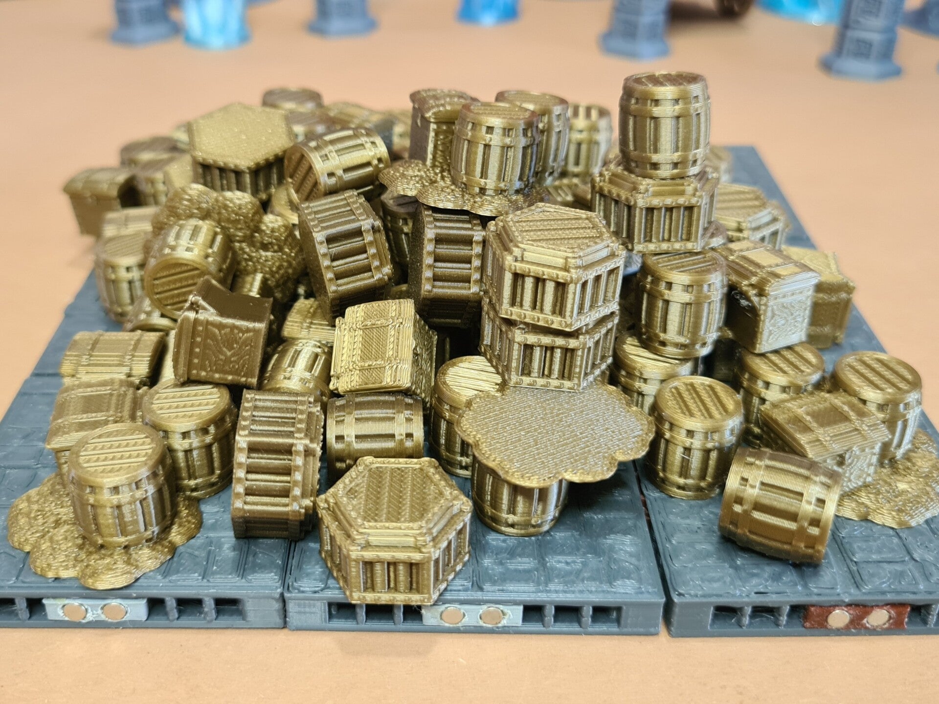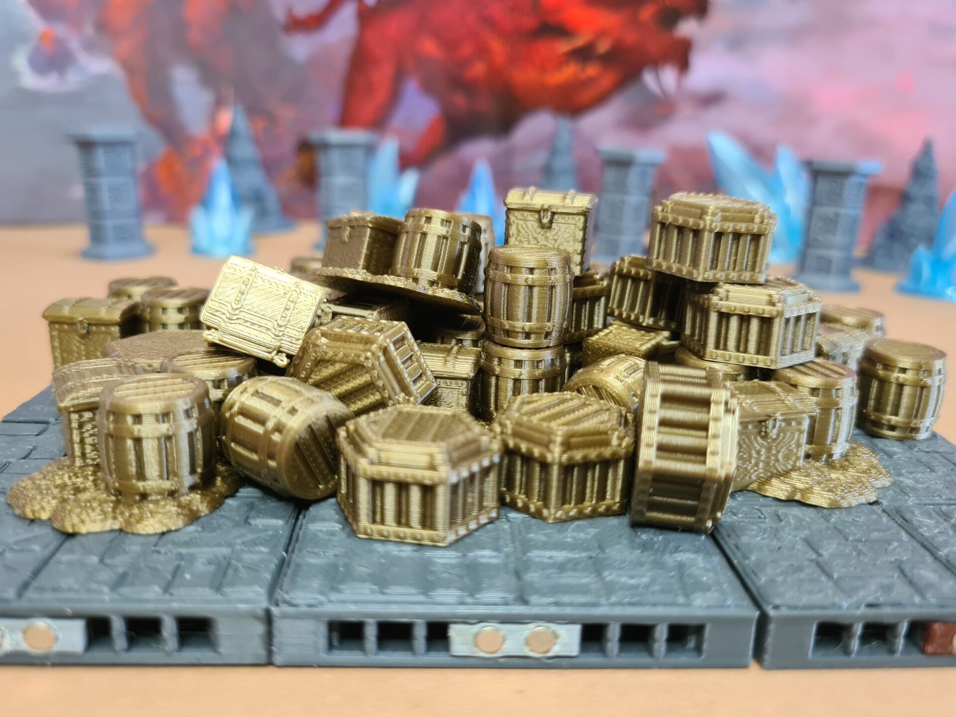 The miniature crates and barrels are designed by Ill Gotten Games and the chests are designed by BriteMinis