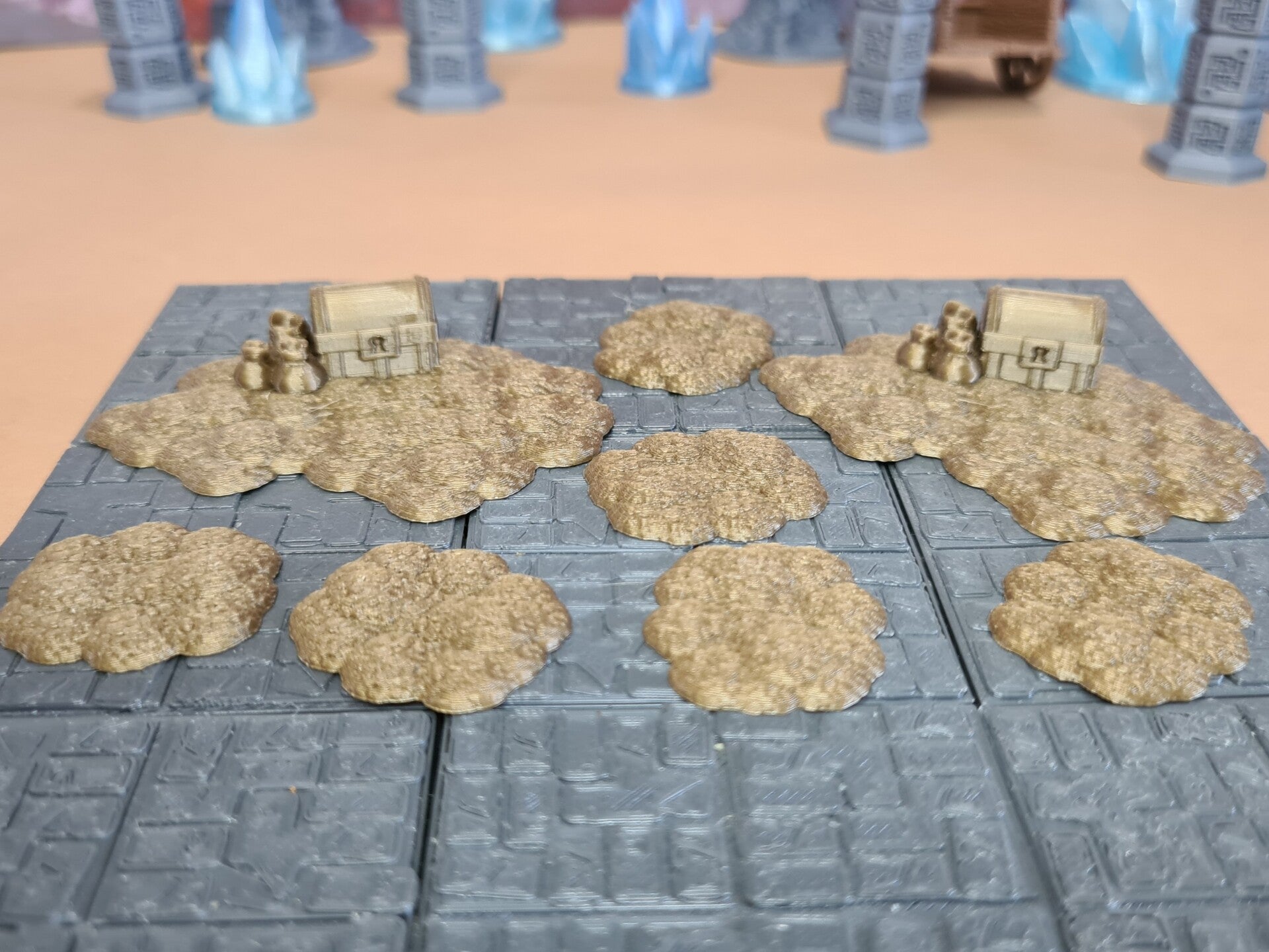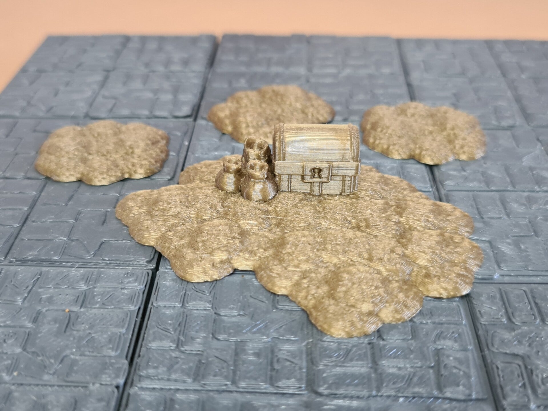 This pile of golden loot is perfect to entice your players and enrich your tabletop games. A heap of coins with an without a chest can be purchased separately in sets of 3, or together in larger quantities at discounted prices. The complete set consists of 3 piles of gold and one pile of gold with a chest.