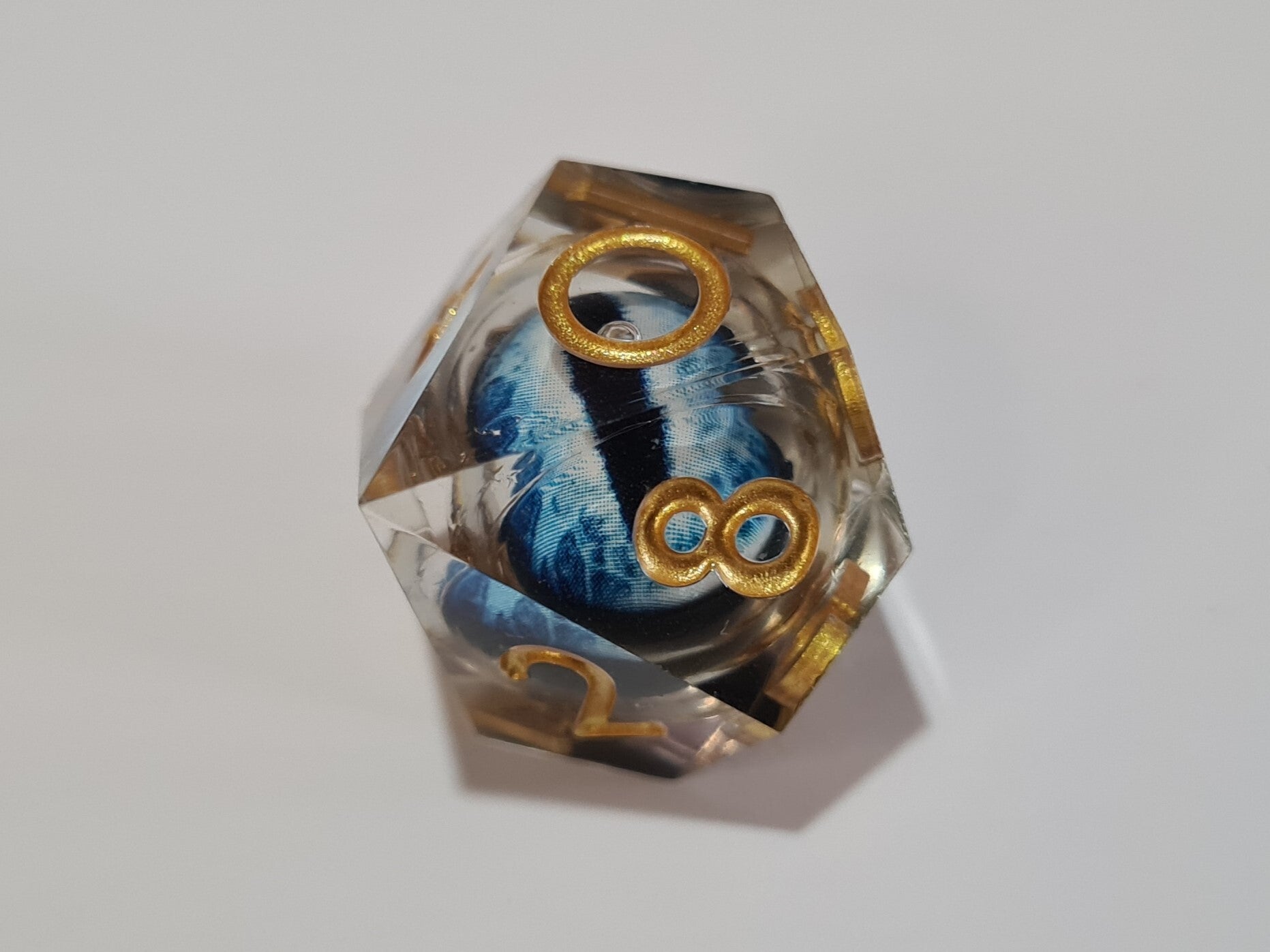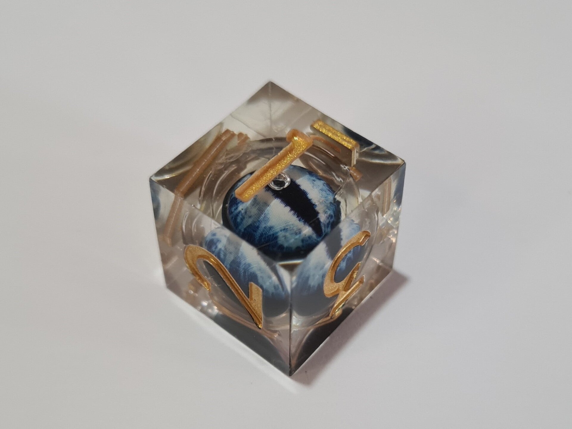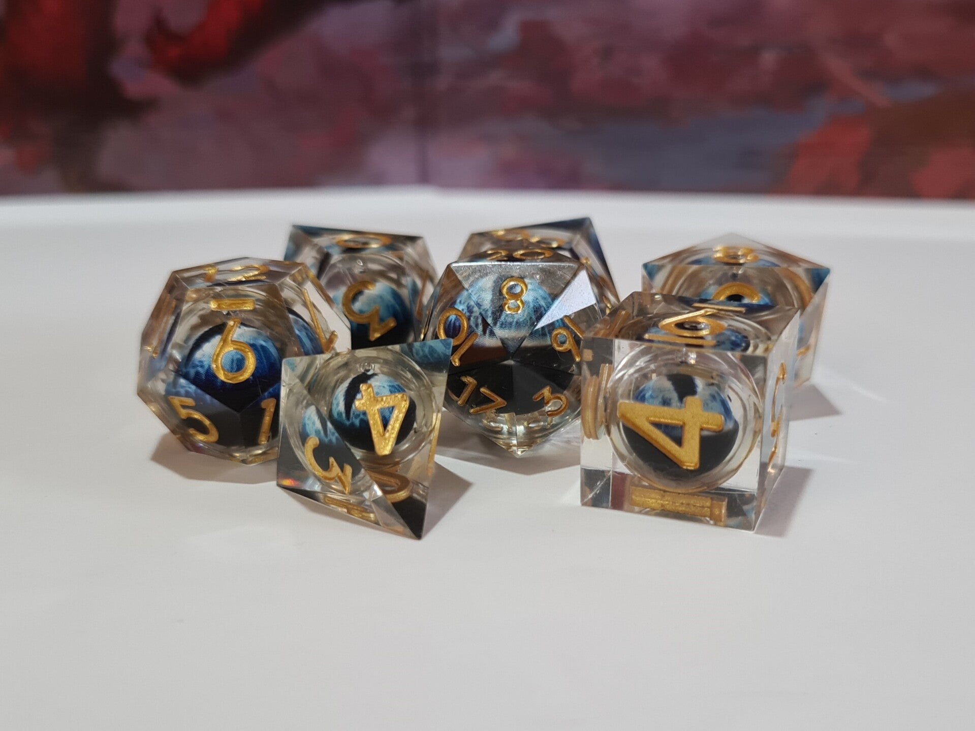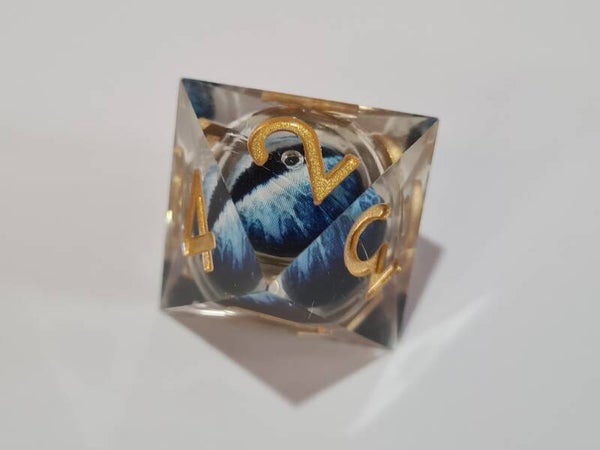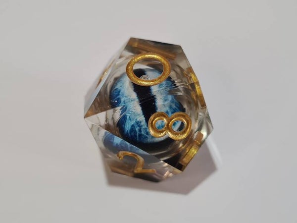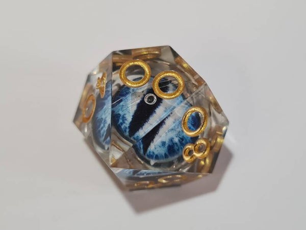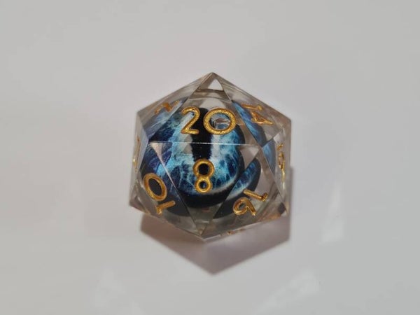 Deep blue dragon's eyes that follow you with their gaze. These liquid core dice have a moving floating eyeball that always looks up after rolling.