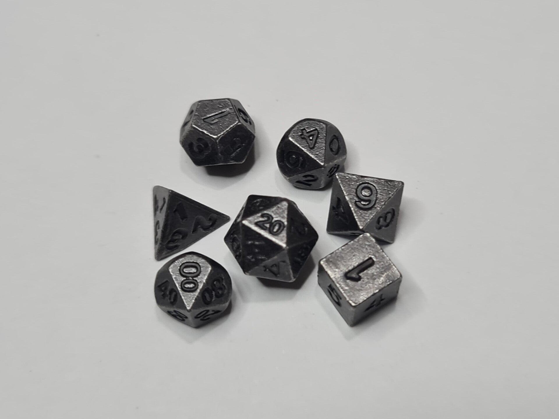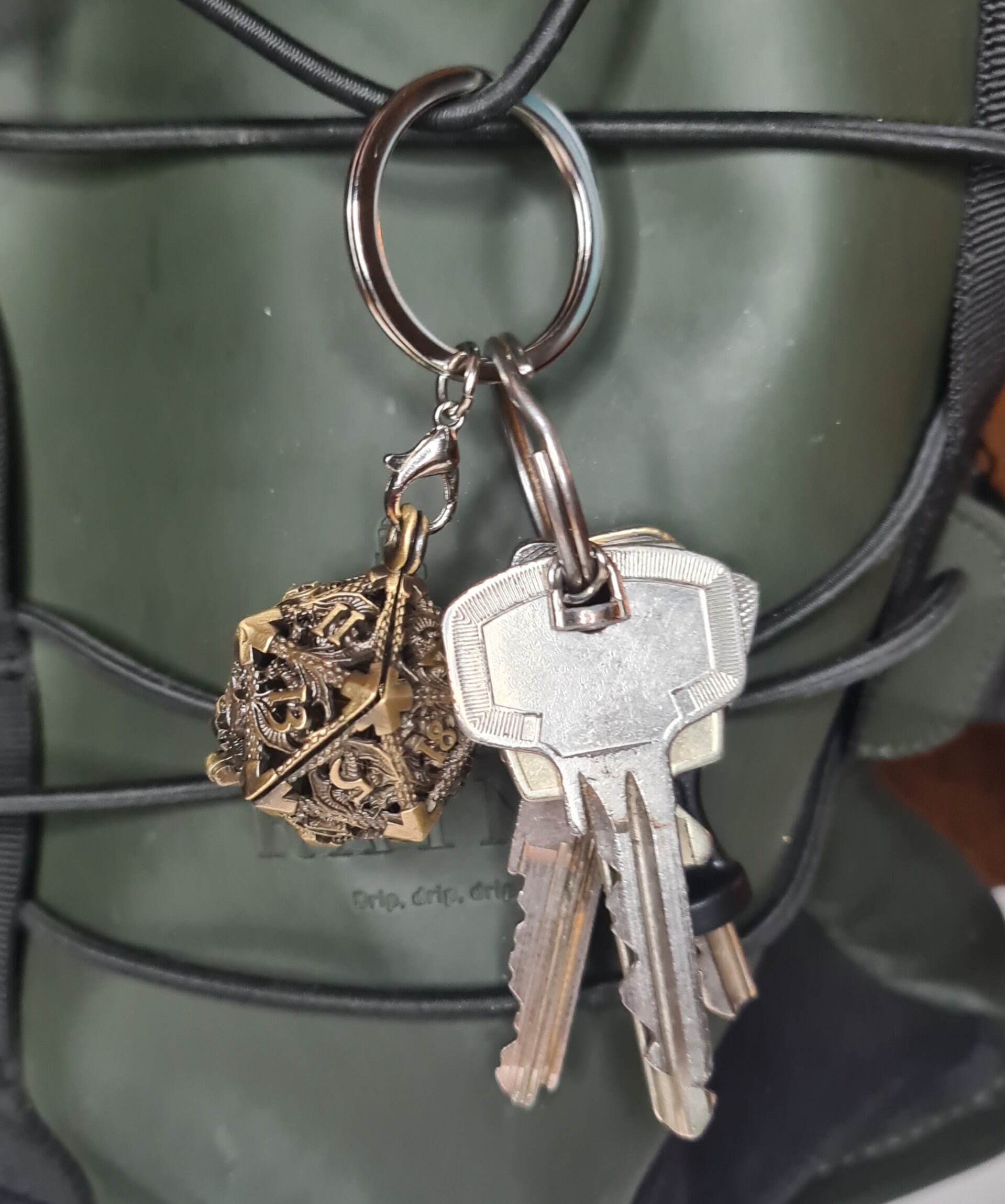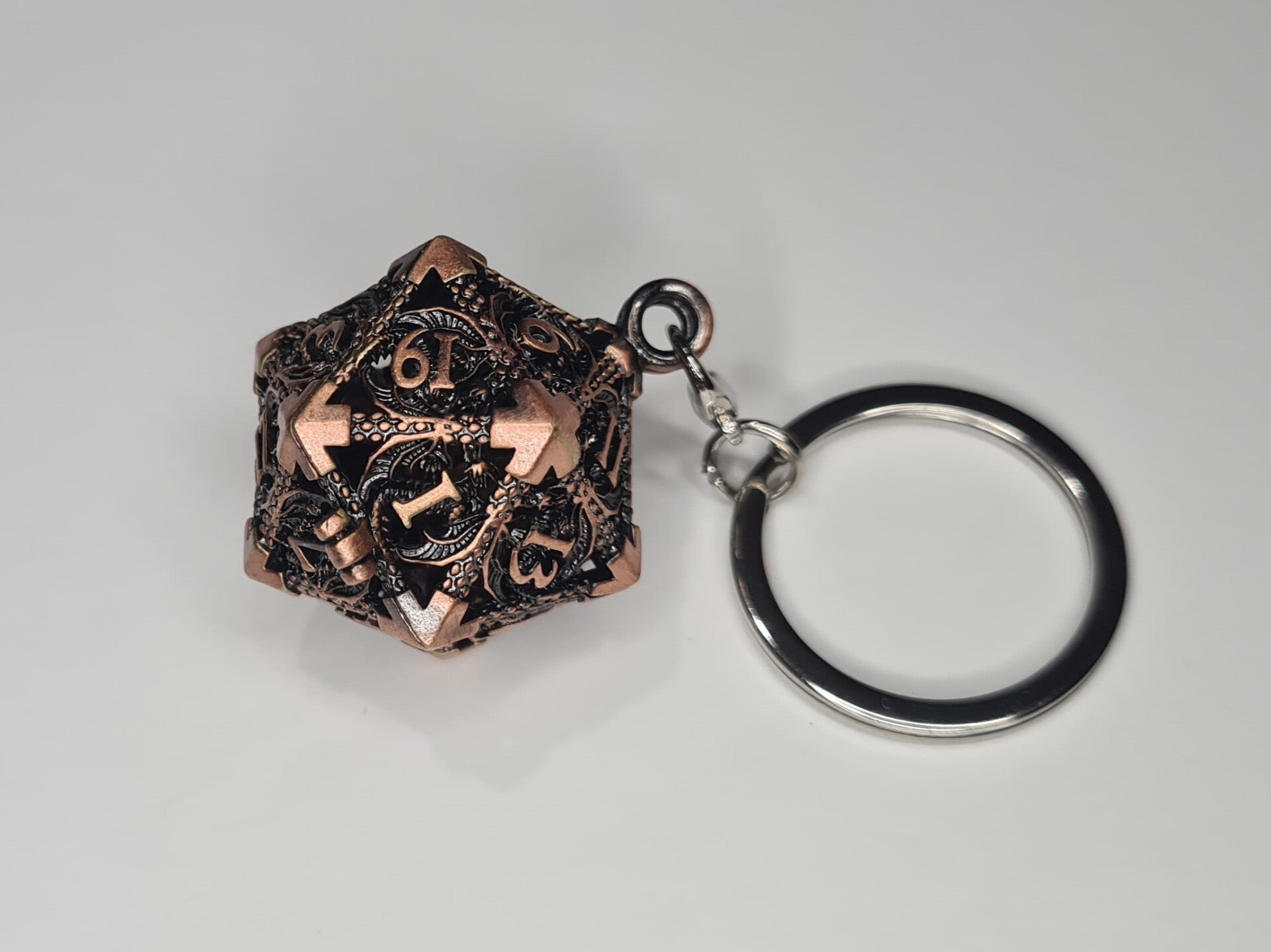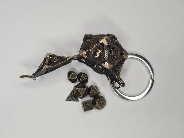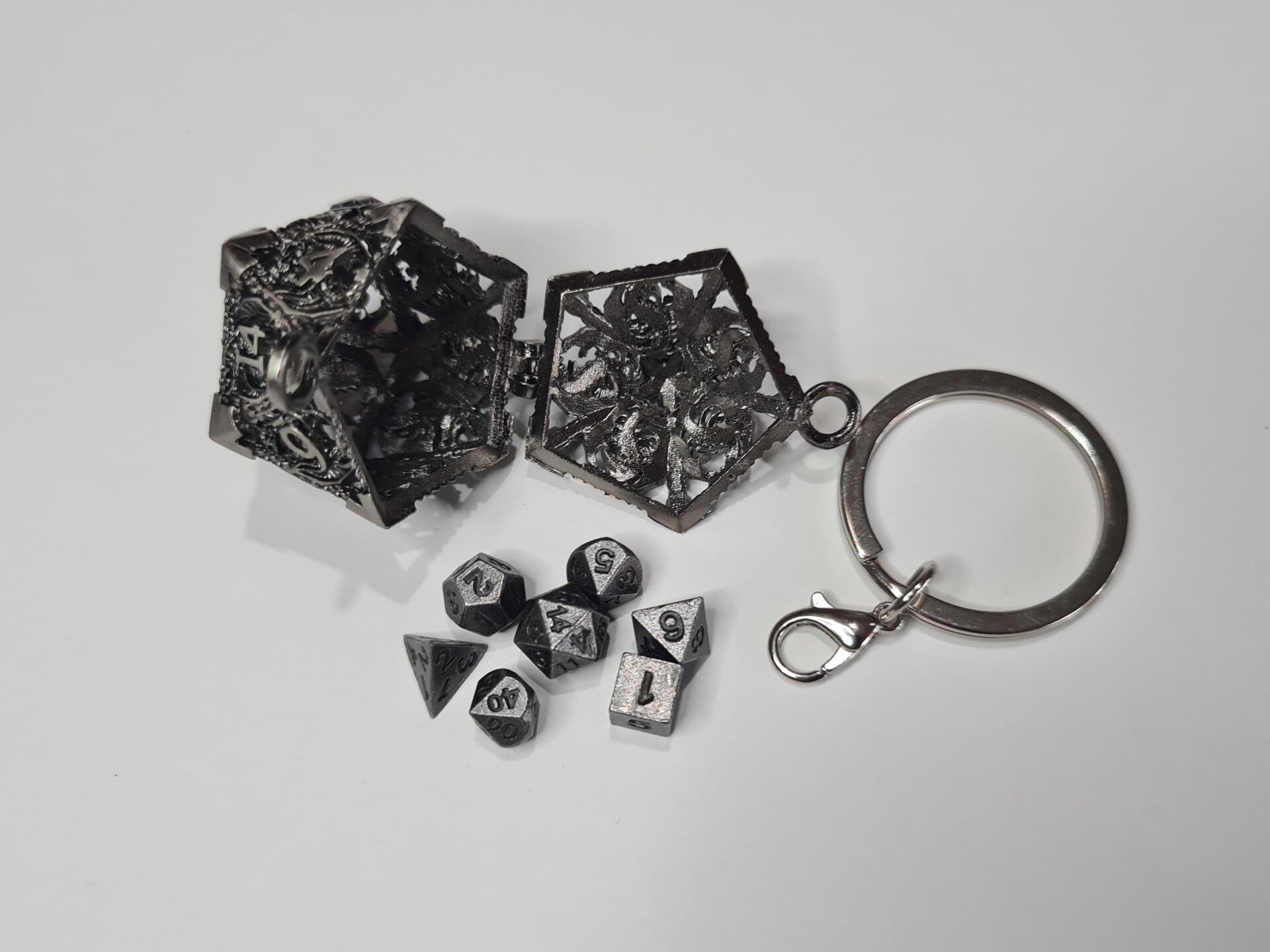 Allways have a set of dice ready with these D20-shaped keychains. The hollow metal D20 contains a complete set of tiny metal polydice. The keychains come in four different colours:SilverBlood Stained SilverBronzeGold