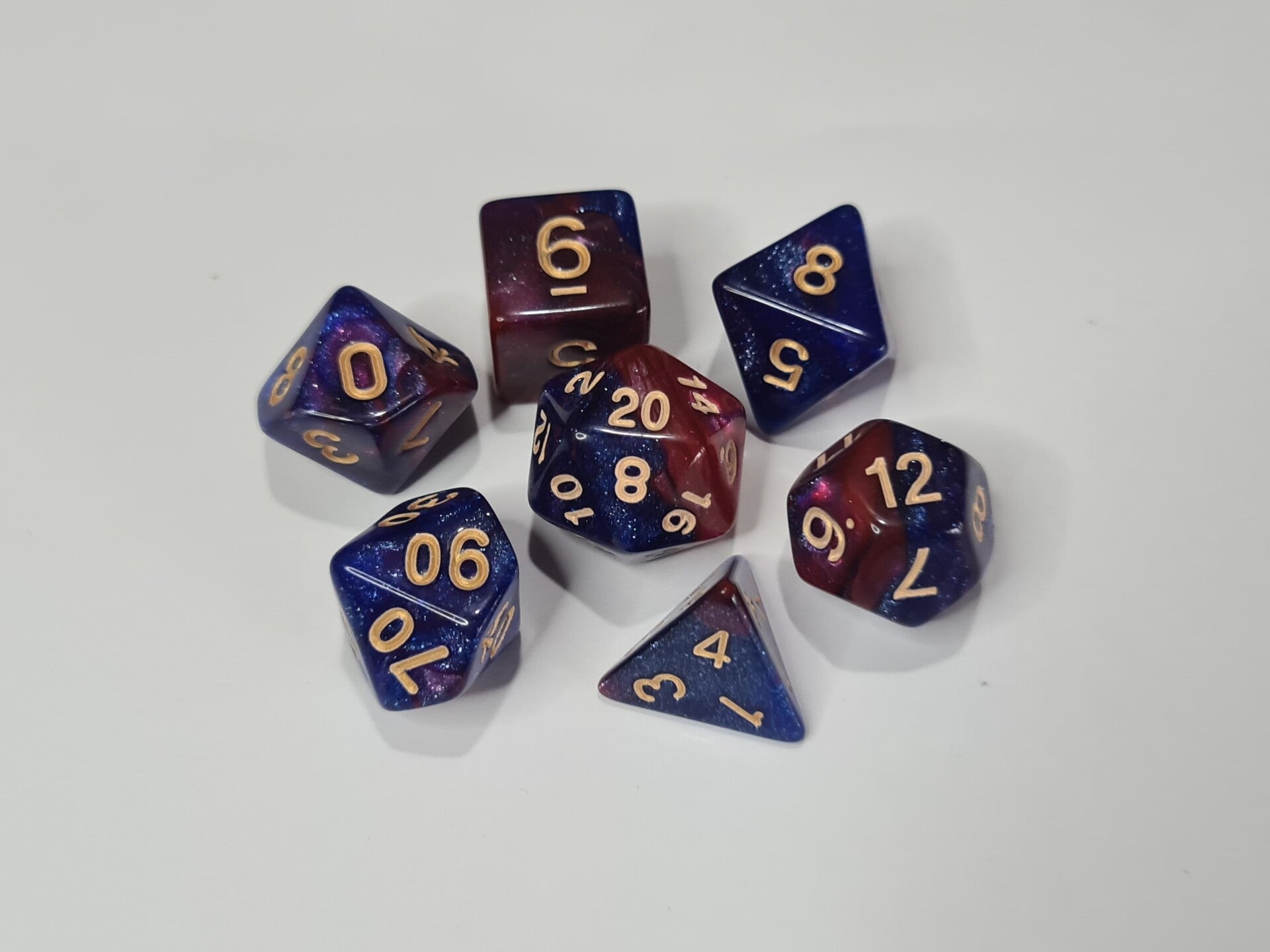 Swirly rust brown and light blue dice with bronze numbers. This set of polyhedral dice consists of the standard seven dice needed for most Tabletop RPGs: