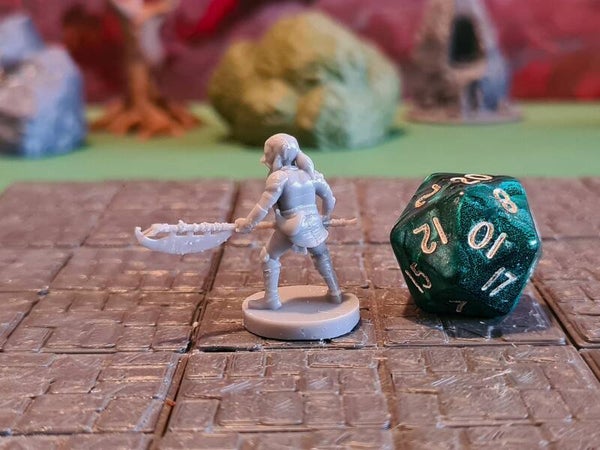 The miniature is scaled for 28mm games common in Dungeons and Dragons (D&D), Pathfinder, and most other popular tabletop games.