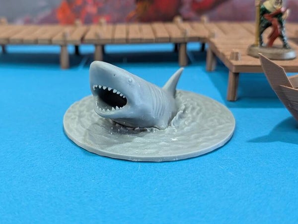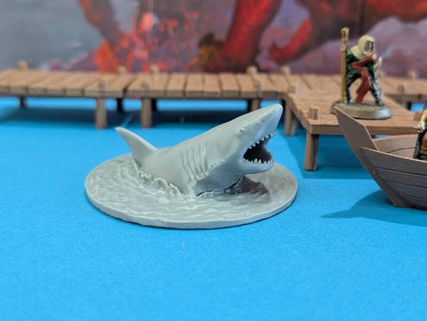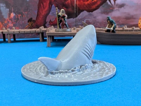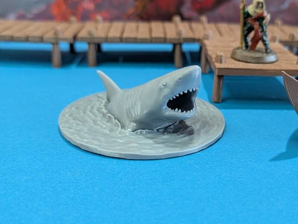 "Watch out with that cut, don't let your blood get in the water" "Why not?". This large shark miniature is a great enemy for mid- level parties on a hig sea adventure.