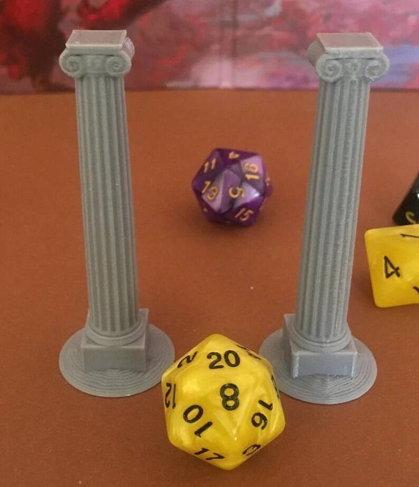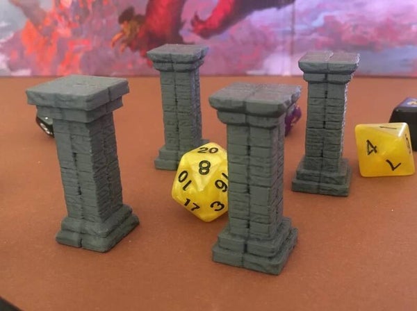 The archway and greek style pillars are designed and licenced by BriteMinis, the dwarven pillars are designed and licenced by Ill Gotten Games, and the brick pillars are designed by DungeonHero.