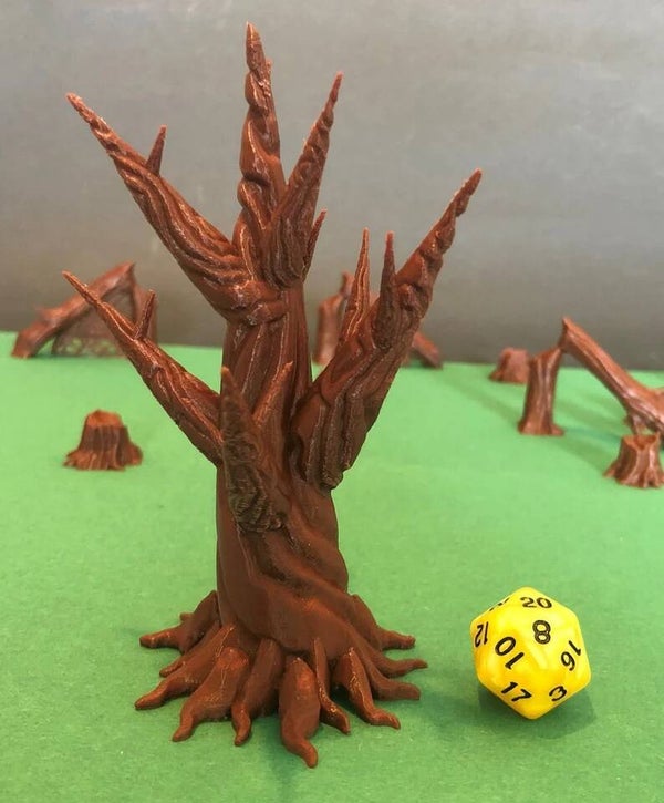 A group of adventurers roams the abandoned graveyard. Reacting to a suddden sound, they turn around and see the moon shining trhough dead spiky branches. Under these cursed trees, woeful spirits start to rise. These miniature spiky dagger trees are perfect for creating creepy encounters such as graveyards, or use them in wilderness encounters. The trees can be bought individually, or as groups of 2 and 4.