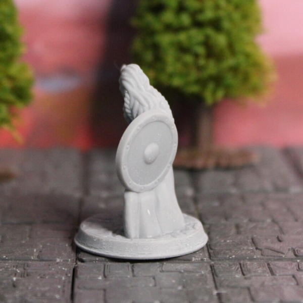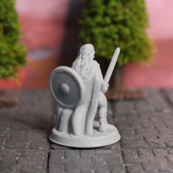This Female Fighter Miniature is scaled for 28mm games common in D&D, Pathfinder, and most other popular tabletop games.